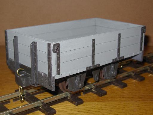 Scratch built from 12mm, 6mm and 3mm ply using plastic strip and Cambrian Models rivets for the strapping and corner pieces the buffers are from IP Engineering with wheels and axle boxes from Accucraft the railway has 2 of these wagons.